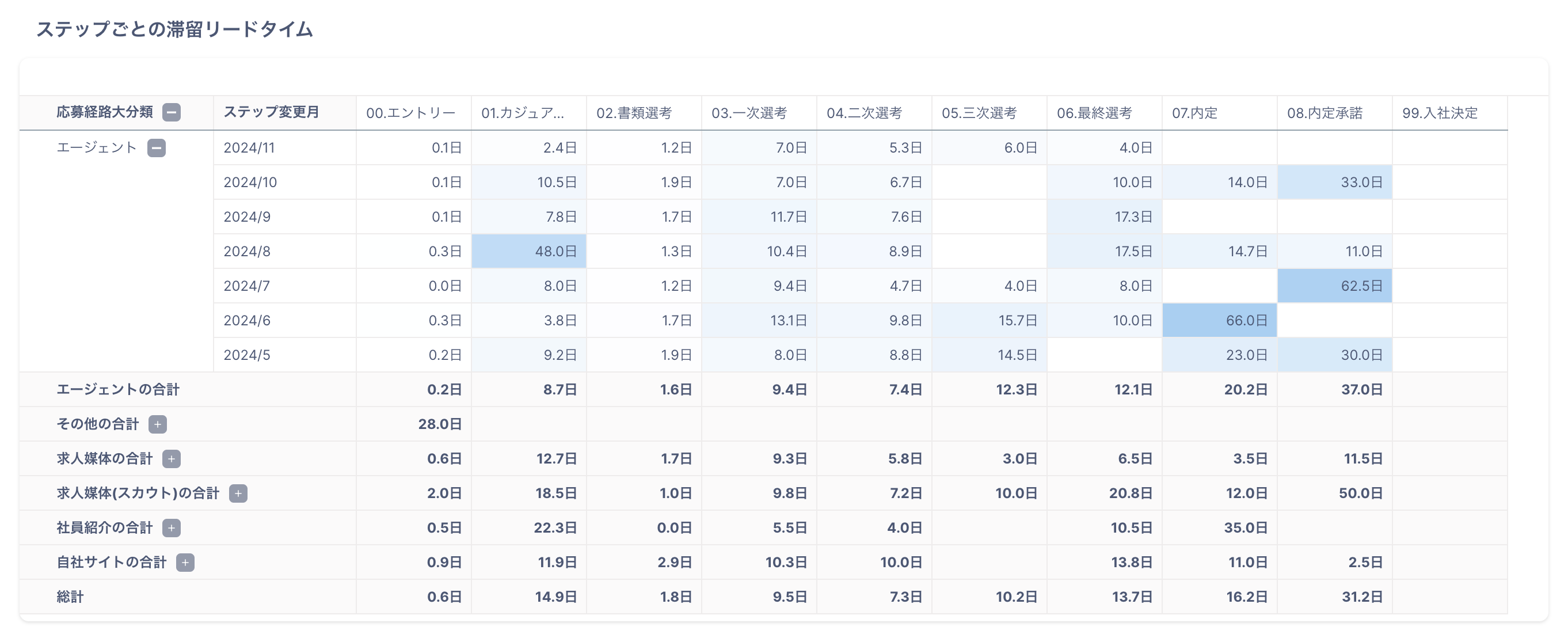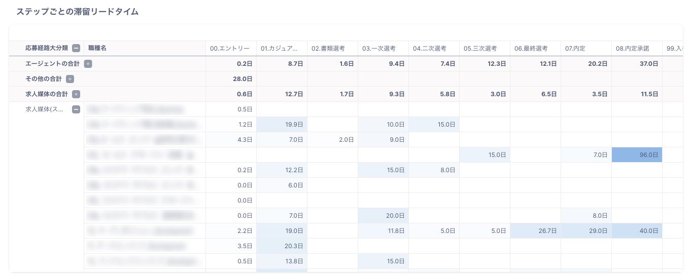 応募経路×職種ごとに各ステップの滞留リードタイムを確認することが可能です。