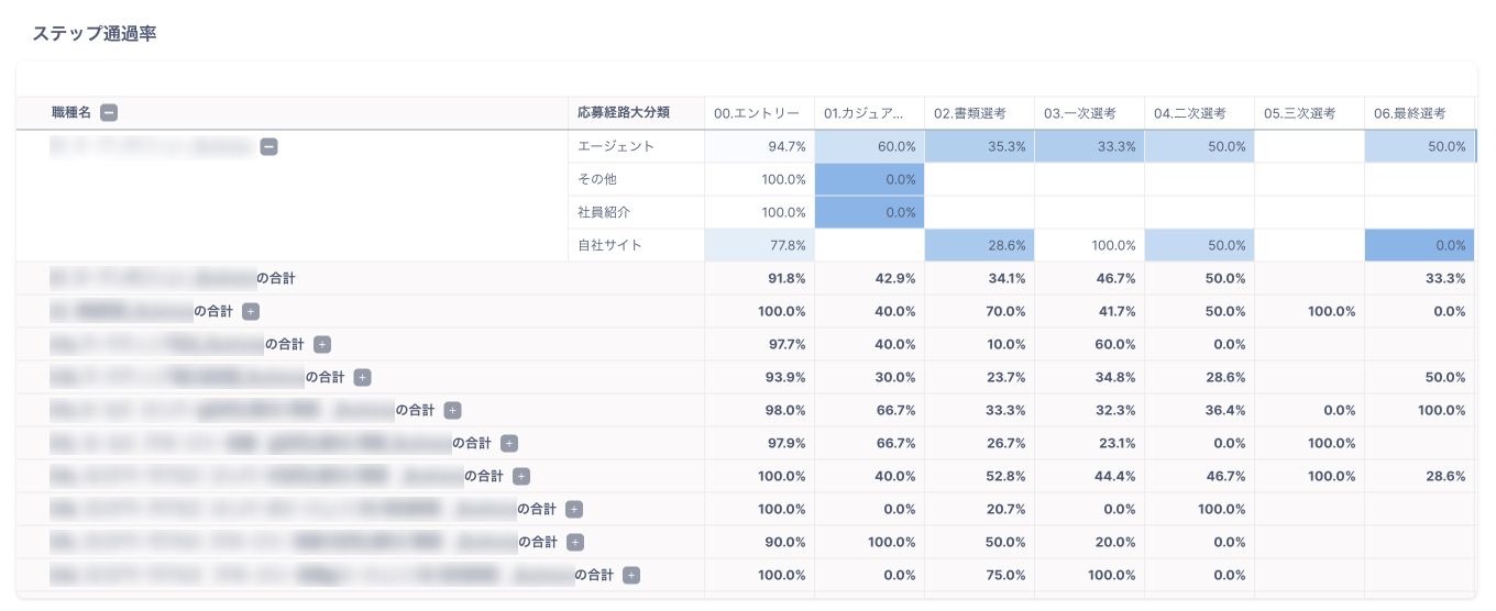 職種×応募経路ごとにステップ通過率を確認することが可能です。