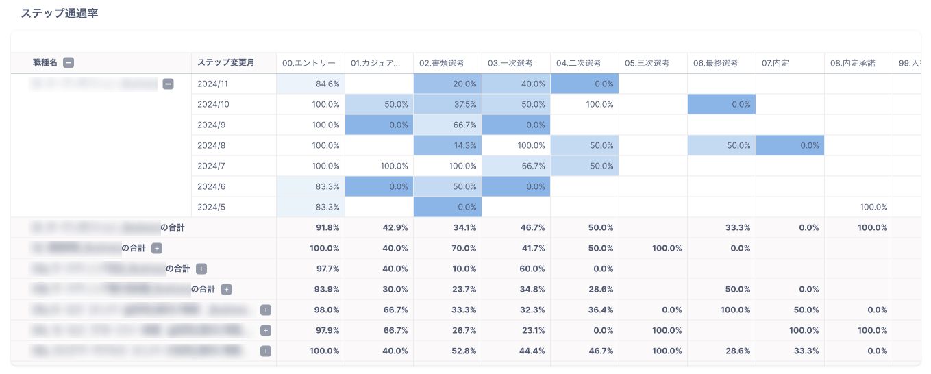 職種×選考ステップ変更月ごとにステップ通過率を確認することが可能です。