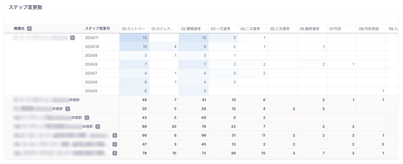 職種別の各ステップ変更日データにより各選考ステップの実績値を月ごとに詳しく確認することが可能です。