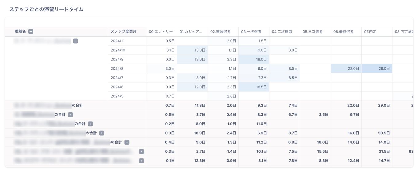 職種×選考ステップ変更月ごとに滞留リードタイムを確認することが可能です。