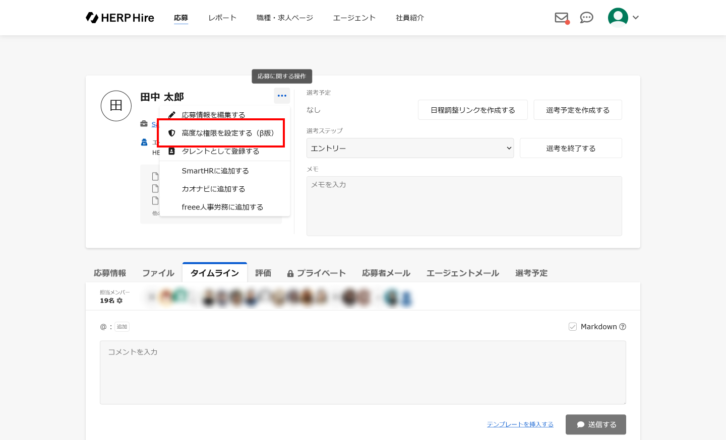 応募詳細画面で応募者氏名の右部にある「…」にて、「高度な権限を設定する(β版)」をクリックする