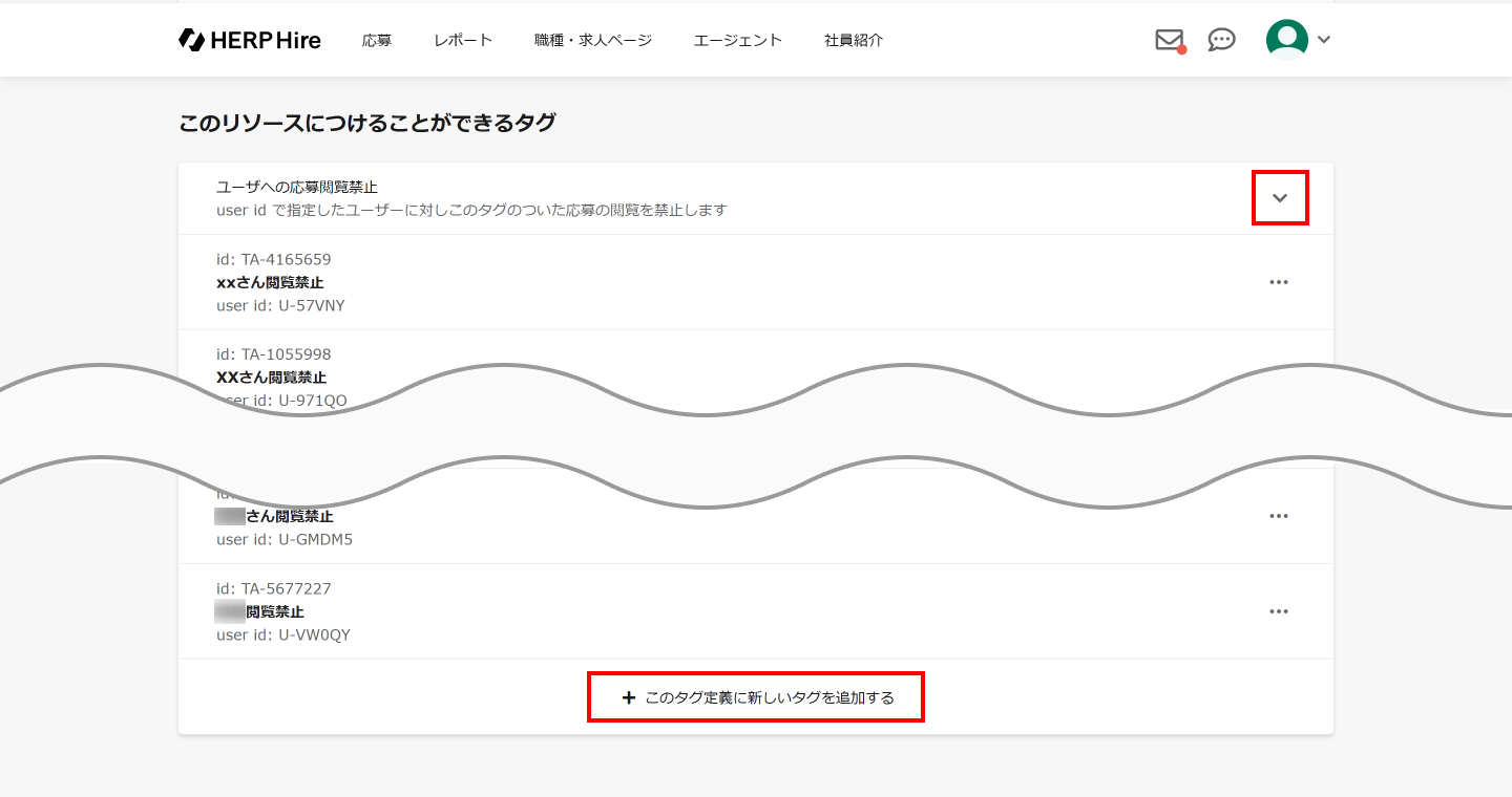 「ユーザへの応募閲覧禁止」の右部にある「∨」を押してアコーディオンを開く。下部の「このタグ定義に新しいタグを追加する」をクリックし、タグの作成画面を開く