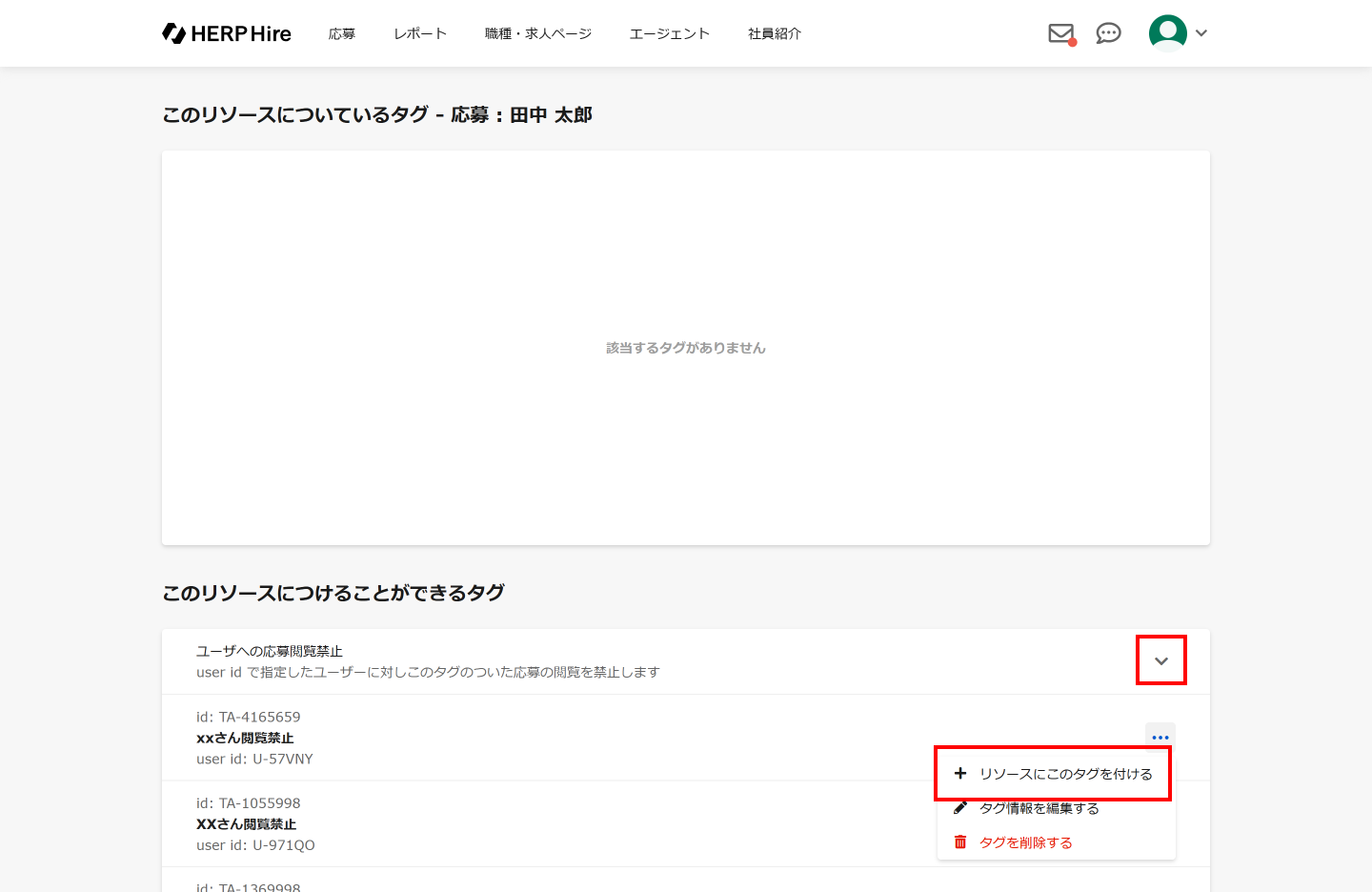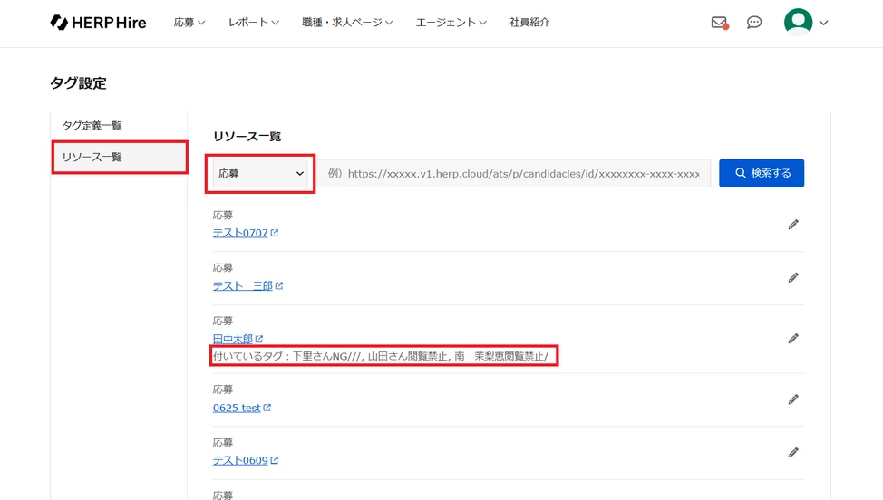 本機能の設定のためには、応募情報に閲覧を禁止したいユーザーの「タグ」を紐づけることが必要です。