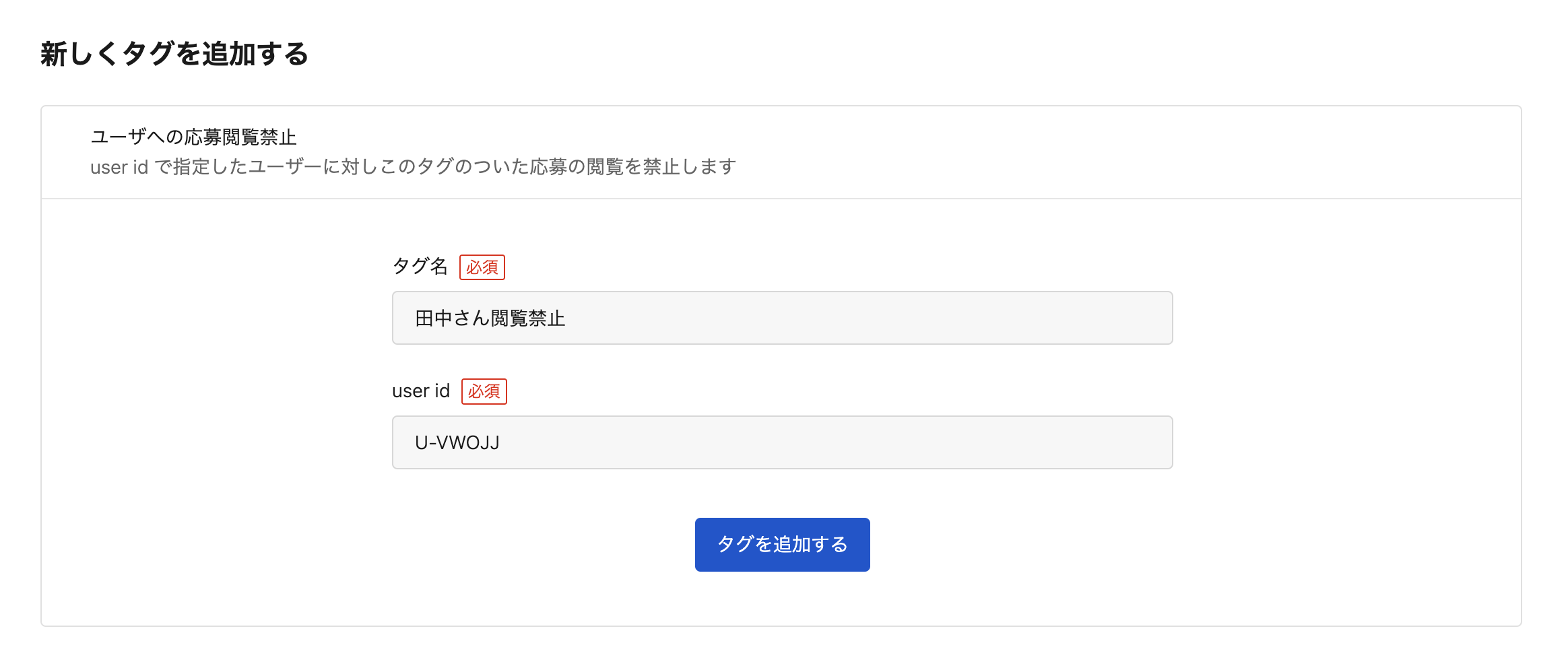 任意のタグ名と、紐付けたいユーザーのuser idを入力し「タグを追加する」にて作成を完了する