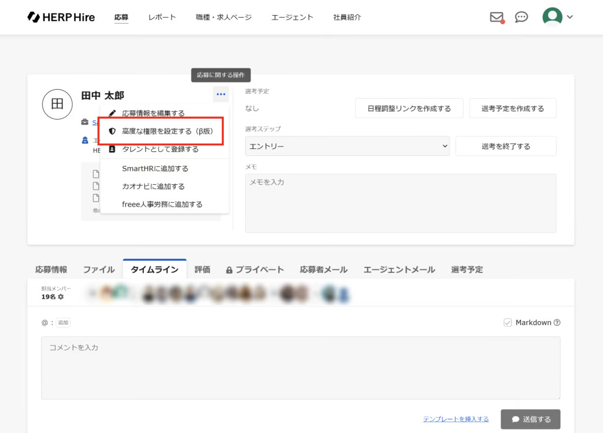 応募詳細で応募者氏名の右部にある「…」にて、「高度な権限を設定する(β版)」をクリックする