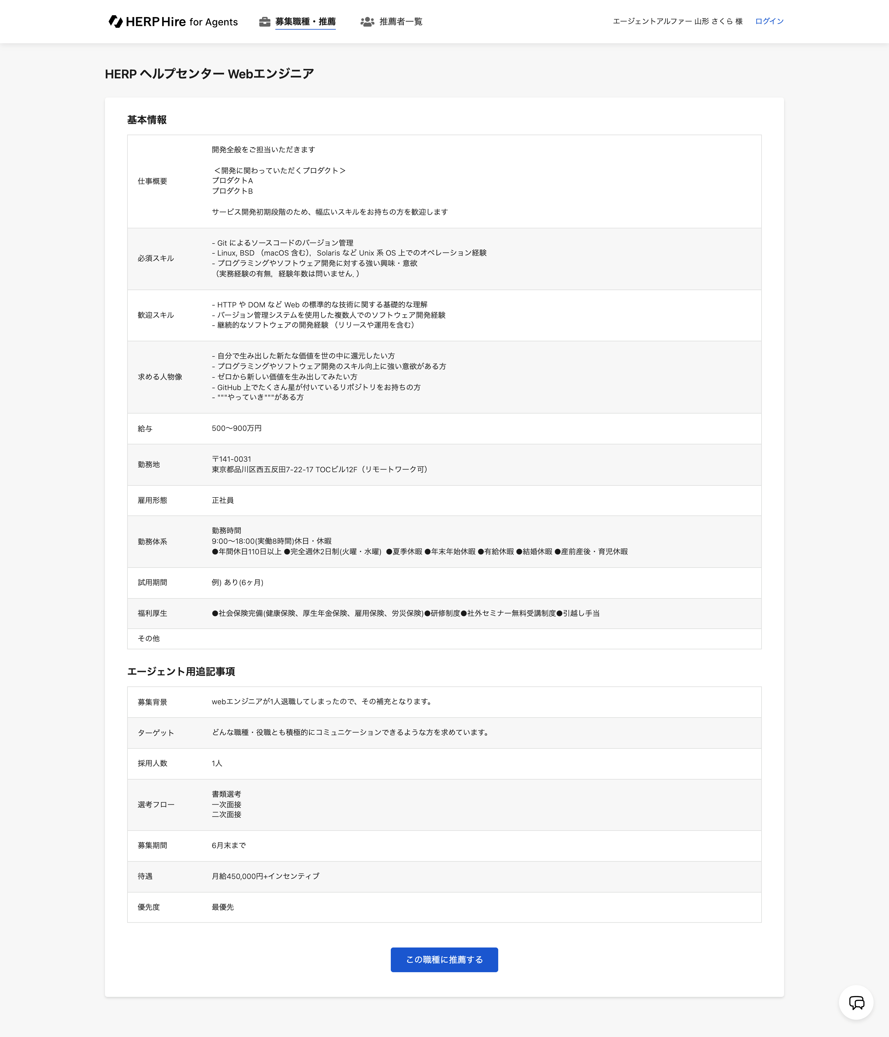 職種情報とは、応募者やエージェントに向けた職種についての情報です。 設定した内容は求人ページや職種へアサインされたエージェントの画面に反映されます。