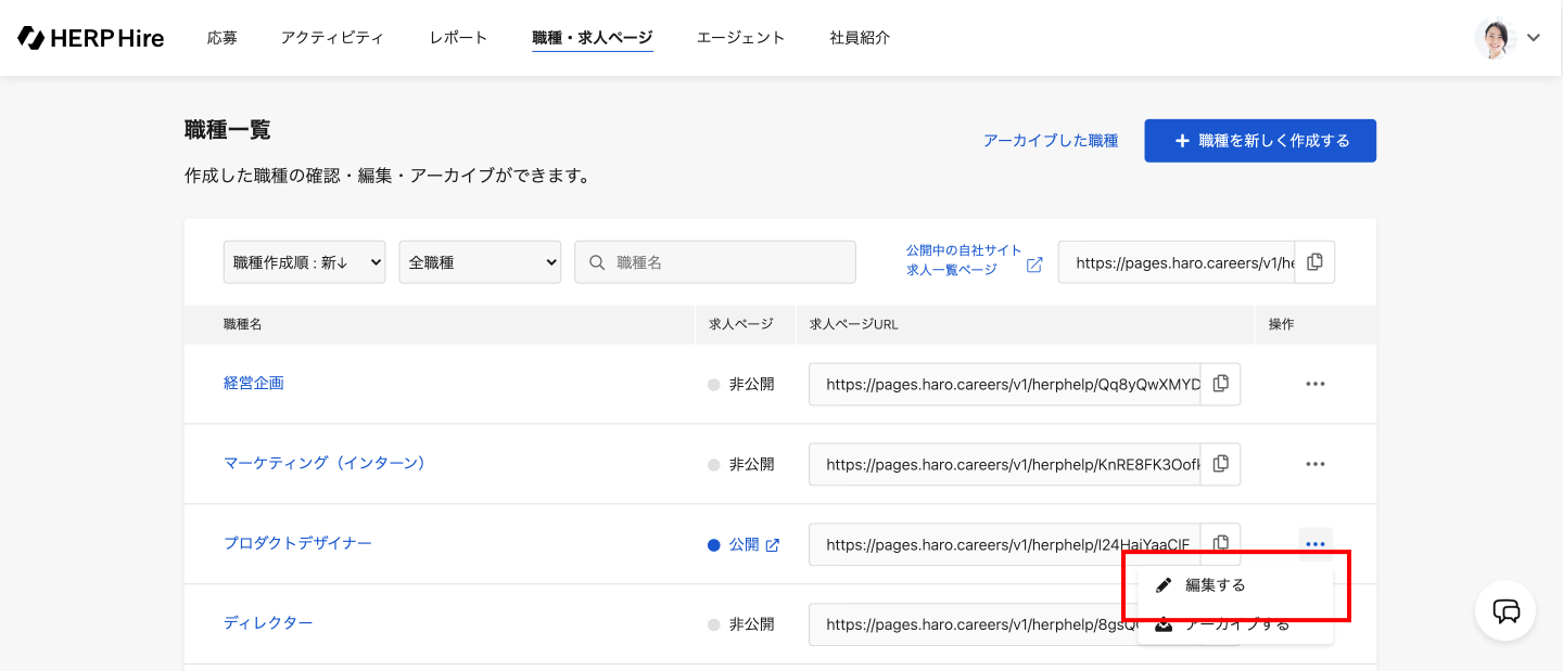 職種一覧から、設定/編集したい職種の「編集する」をクリックする