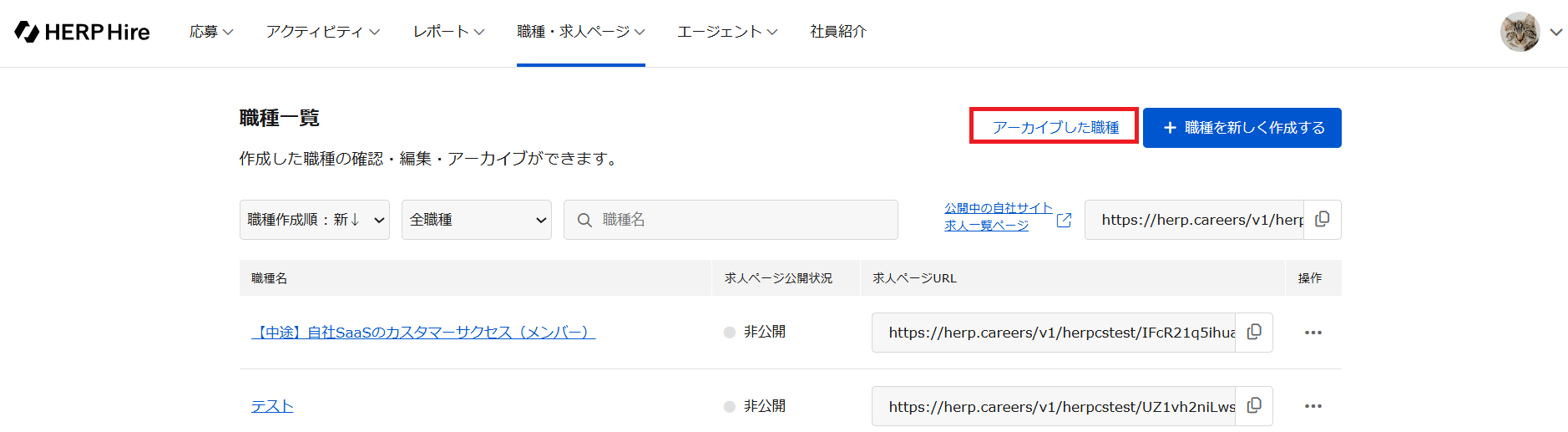 アーカイブすると、自動的に公開中の自社サイト求人一覧ページからも削除されます。また、自動的にエージェント向けの募集職種一覧ページでも非公開になります。