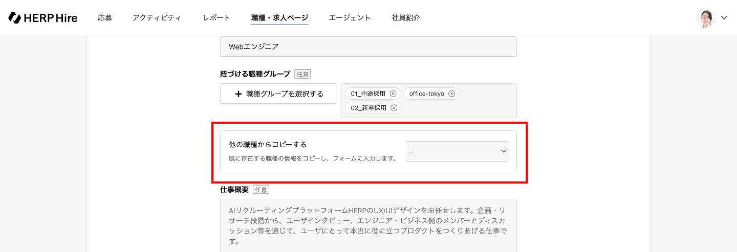 選択した職種の、仕事概要以下の情報をコピーすることができる