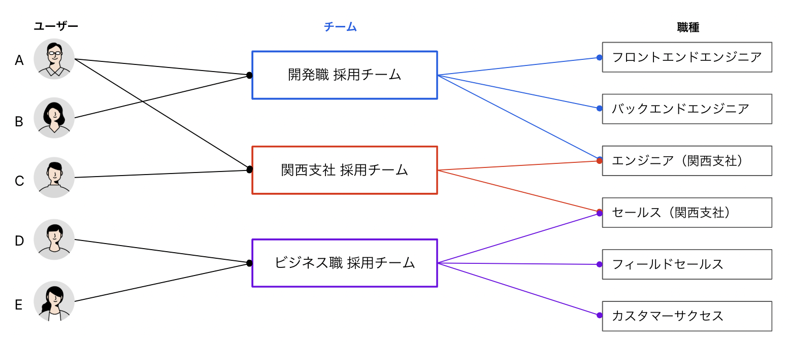 職種別権限機能(職種別ゲスト権限、職種別リクルーター・アシスタント権限)を設定すると、各ユーザーは所属するチームに紐づいた職種の応募に自動でアサインされ、閲覧権限が付与されます。
