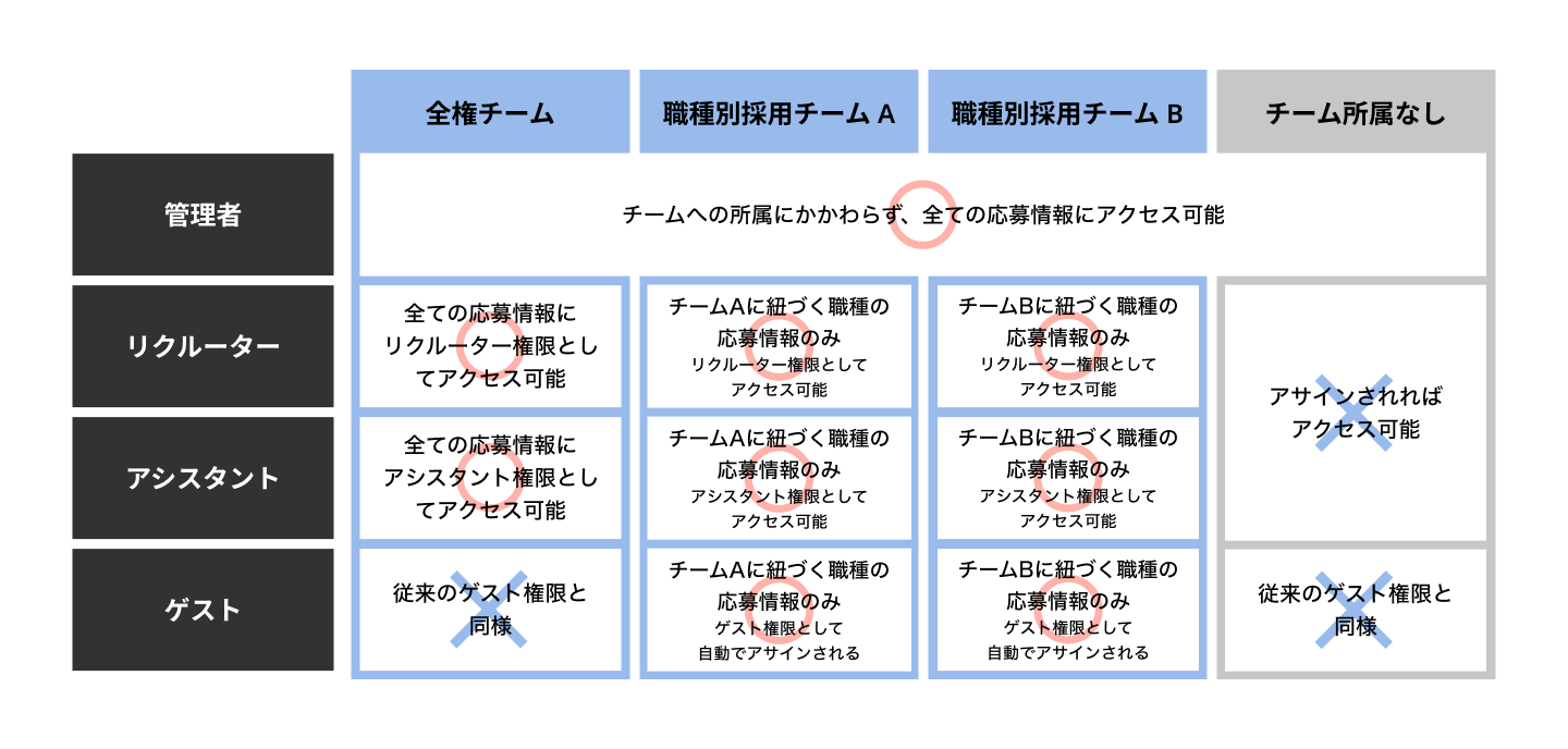 アシスタント/リクルーター権限のメンバーは全ての応募情報にアクセスが可能 | 事前に設定した職種の応募情報にのみアクセスが可能 |