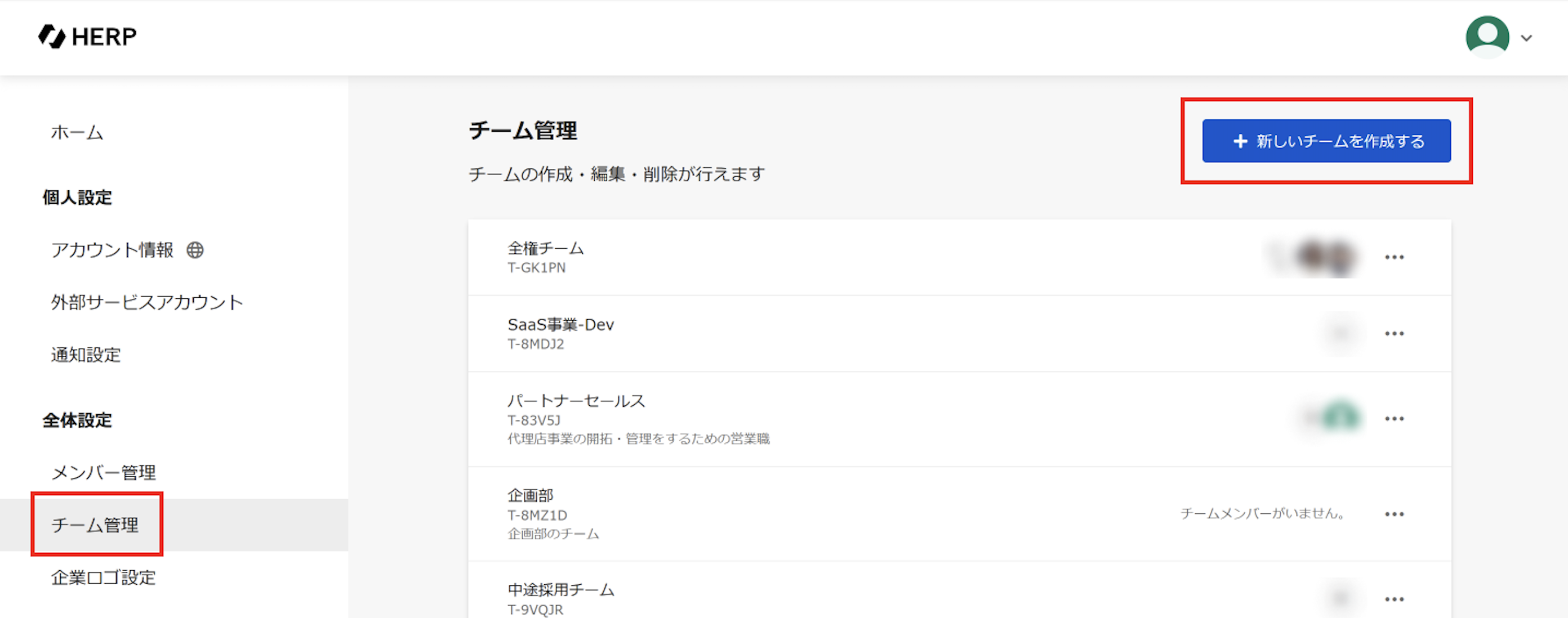 管理画面(アカウント・全体設定)で「チーム管理」をクリックし、「新しいチームを作成する」をクリックする