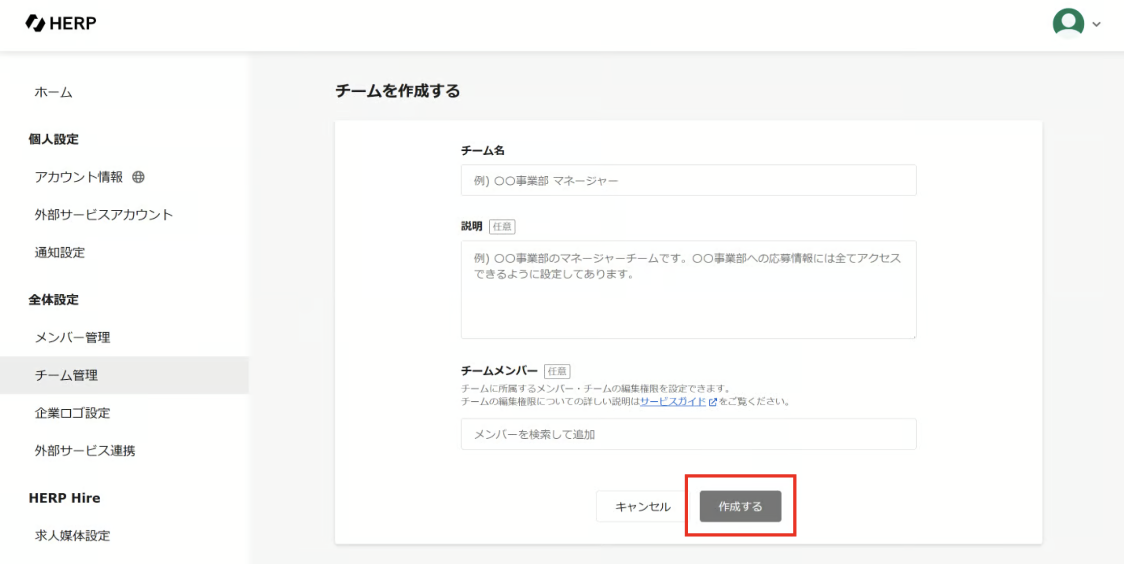 チーム名・説明・チームメンバー・各メンバーのチームの編集権限を設定し「作成する」をクリックする