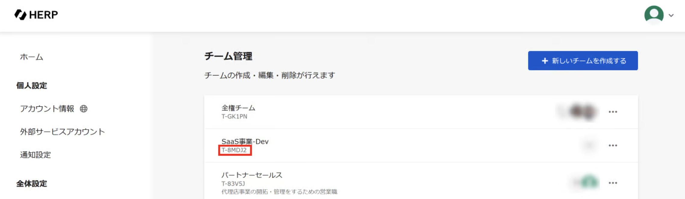 アカウント・全体設定の「チーム管理」で、チーム名の下部にある ”T-XXXXX” がteam idです。