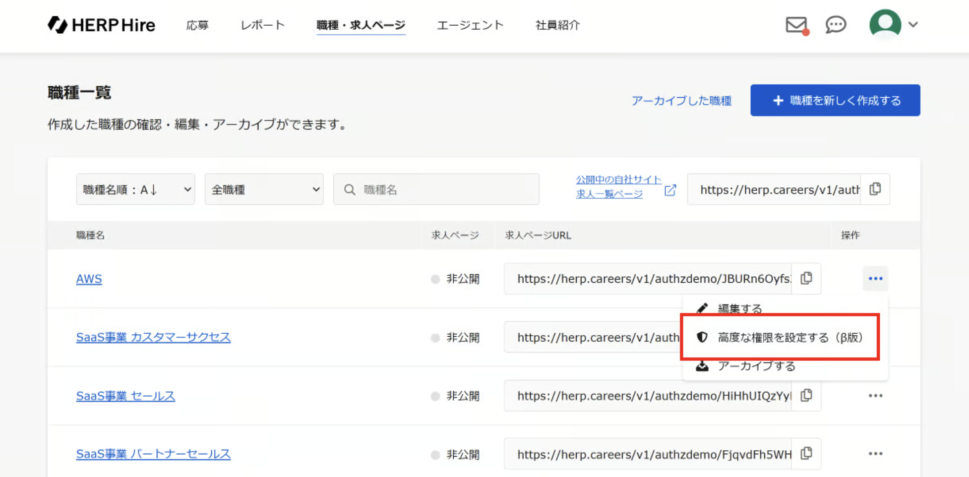職種・求人ページ内の「職種一覧」から、チームと紐付けしたい職種の右部にある「…」にて「高度な権限を設定する(β版)」をクリックする。