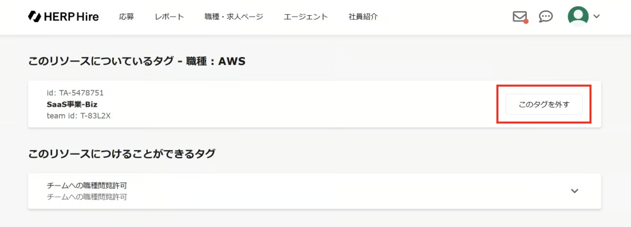 職種との紐付けを解除したいチームのタグの「このタグを外す」をクリックする