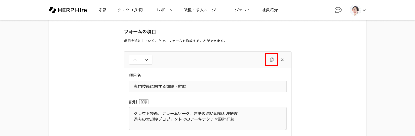 同様の質問形式や選択回答の候補を転用する際には、同フォーム内で作成した項目を下記ボタンをクリックして複製する