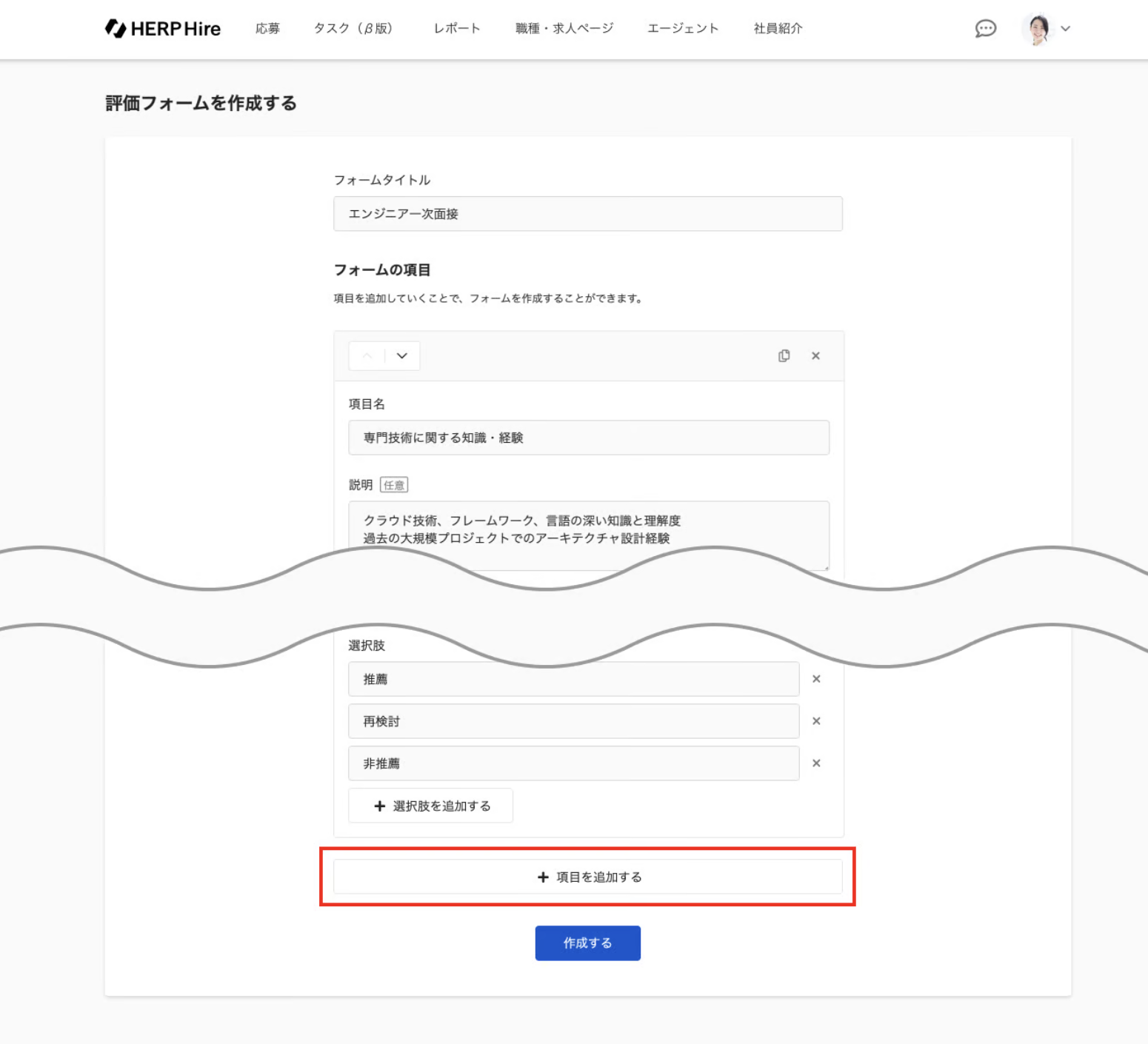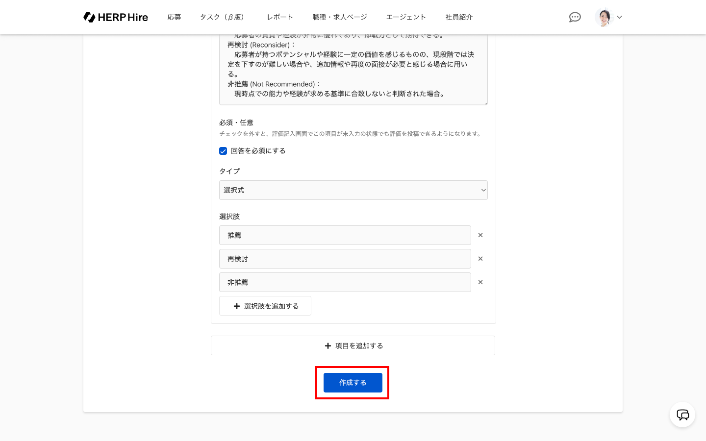 「作成する」をクリックすれば、複製した評価フォームが保存されます。