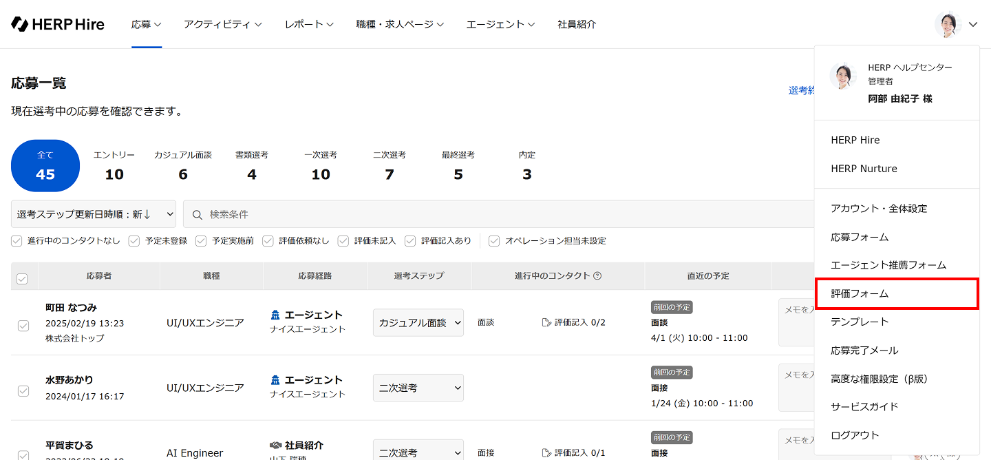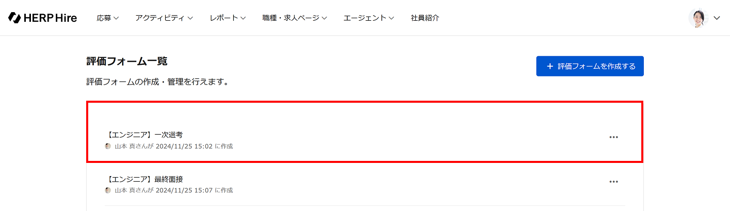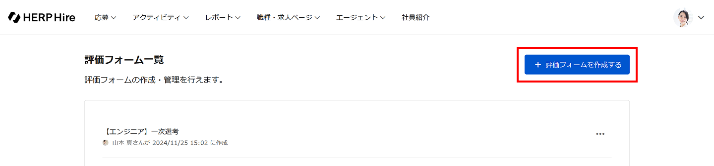 右上のアバターをクリックしてメニューを開き、「評価フォーム」をクリックします。