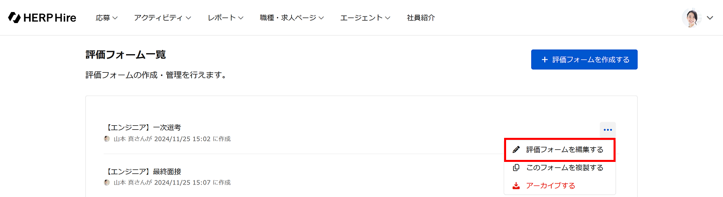 編集したいフォームの「・・・」アイコンから、「評価フォームを編集する」をクリック。