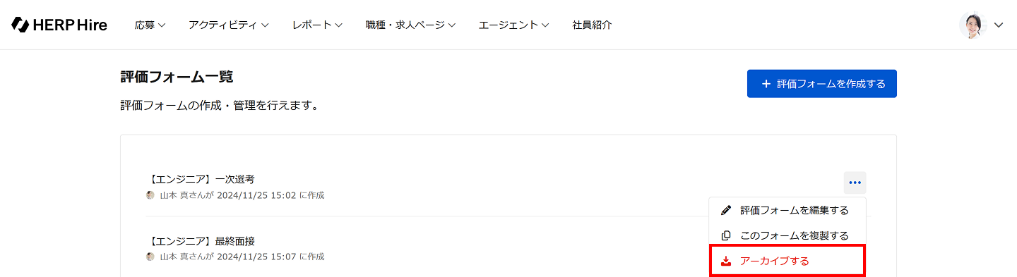 アーカイブすると、評価依頼時の選択肢およびフォーム一覧画面に表示されなくなります。