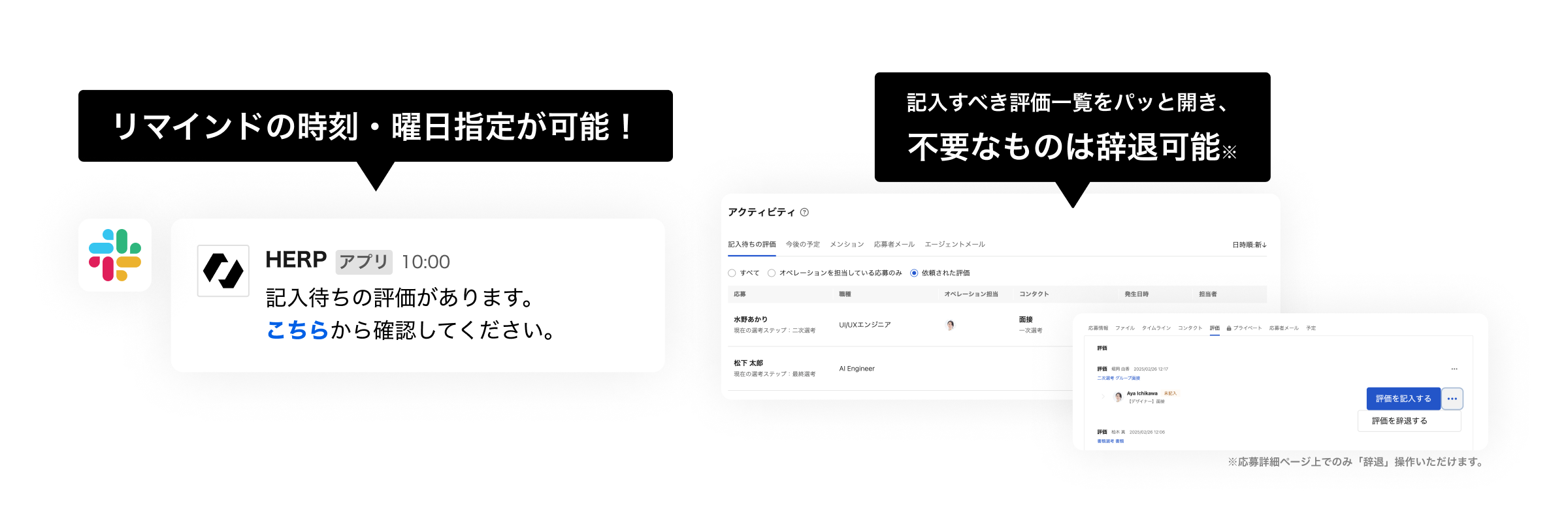 これまで、評価記入をリマインドしたい場合には、応募のタイムラインやHERP Hire外にて、手動でご連絡いただく必要がありました。