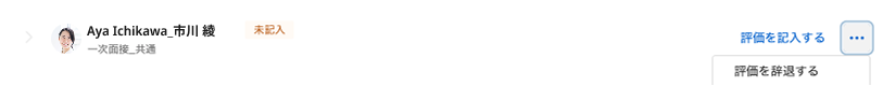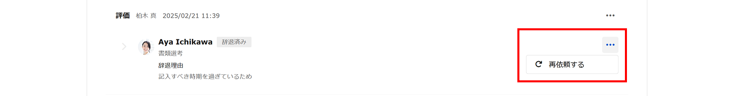 応募詳細の「コンタクトタブ」「評価タブ」にて、辞退した評価の右部にある「…」より「再依頼する」をクリック