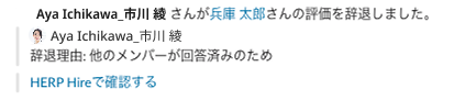 評価を辞退すると、Slack(チャンネル通知・依頼者へのDM)・メールで通知が届きます。