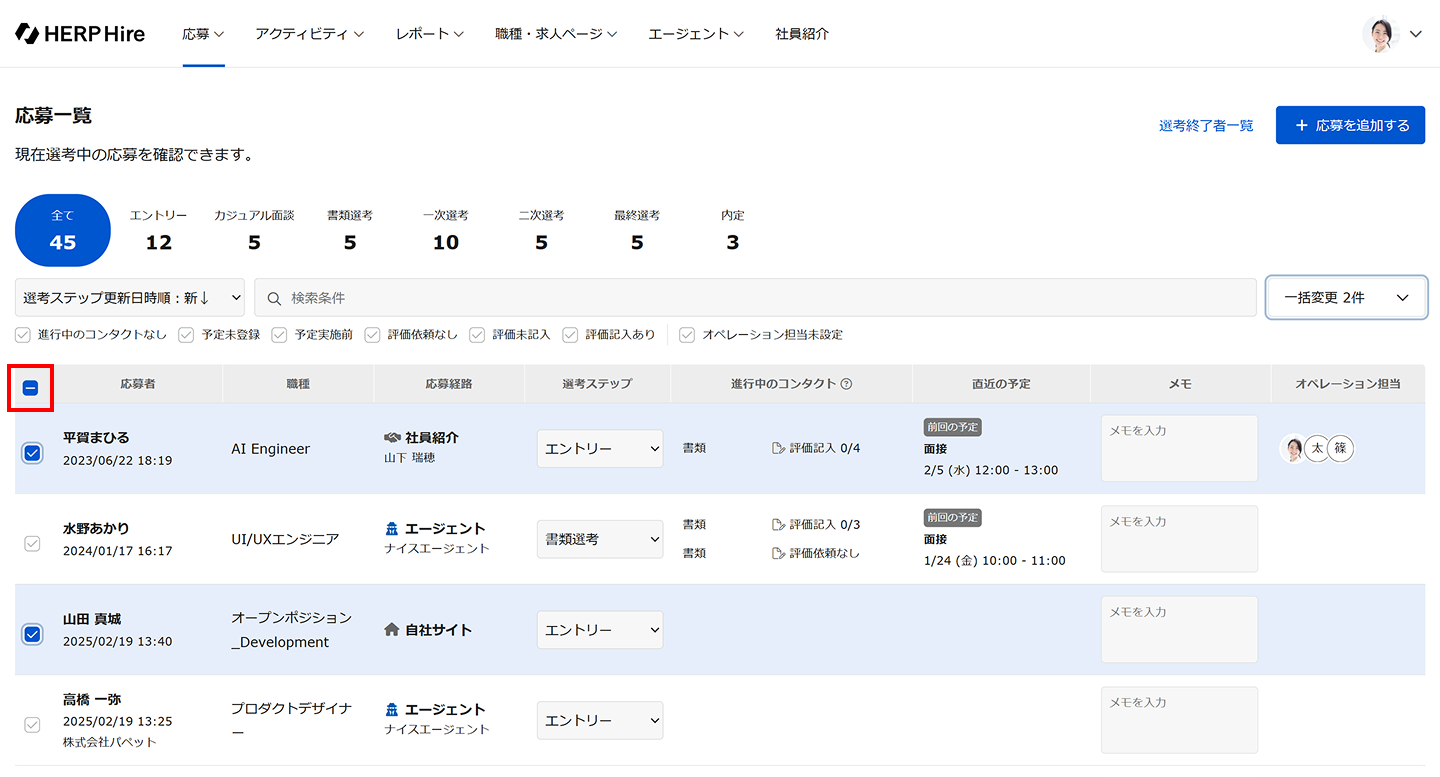 ※最上部のチェックボックス(図中の赤枠)にチェックを入れると表示している応募者全員の選択が可能です