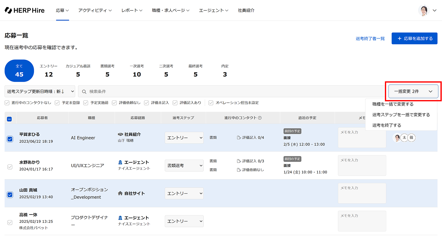 右上の 「一括変更 X名 」をクリックする※このボタンは応募者を選択するとクリック可能になります