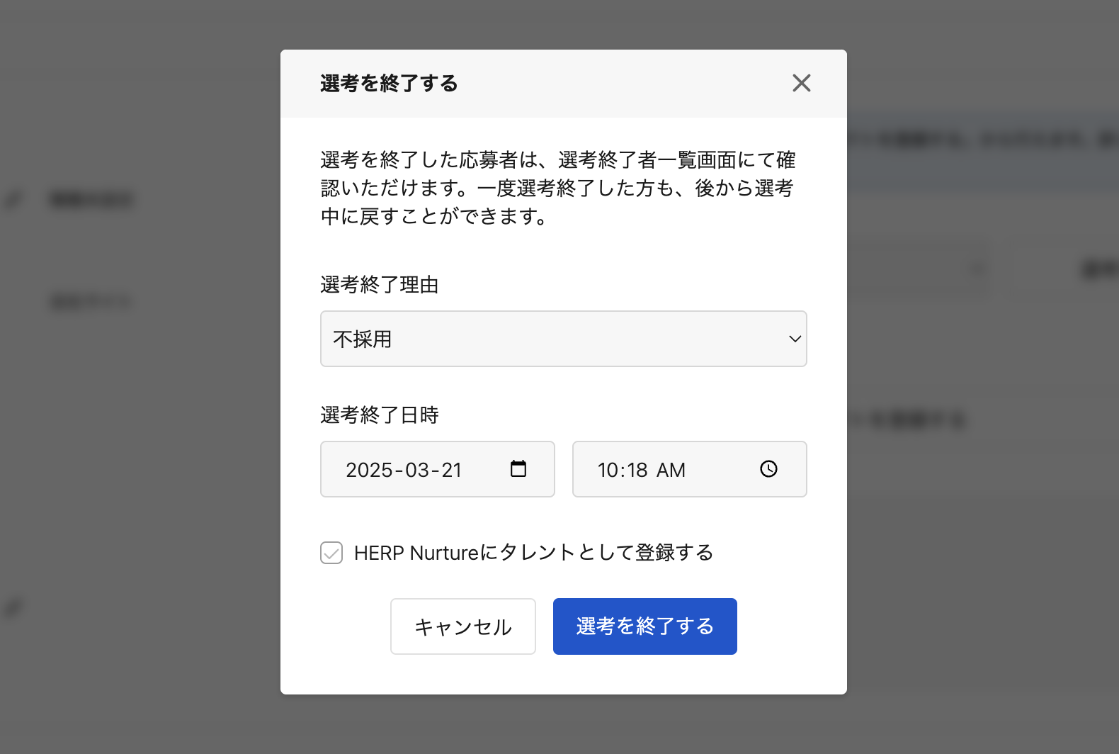 確認画面で「選考終了理由」と「選考終了日時」を入力し、「選考を終了する」をクリックします。
