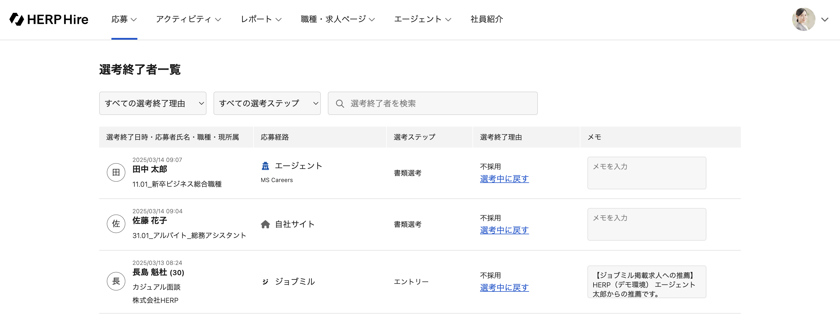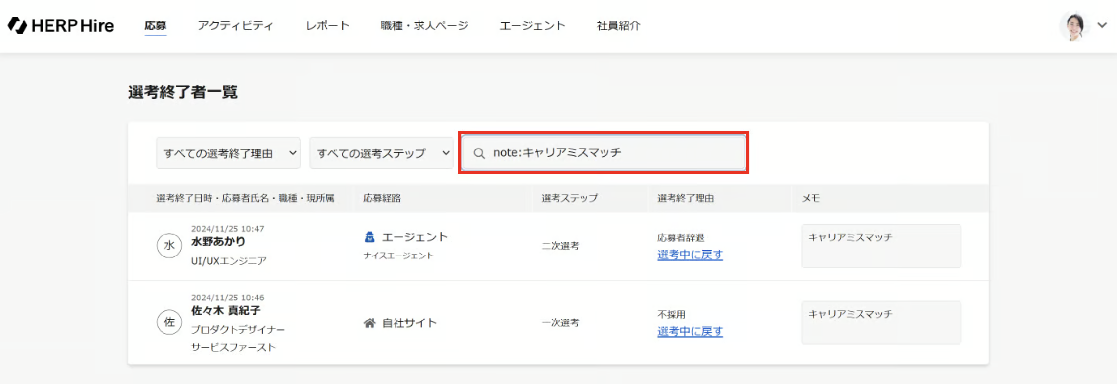メモ欄に記載の内容は「選考終了者一覧」画面にて検索を行えます。