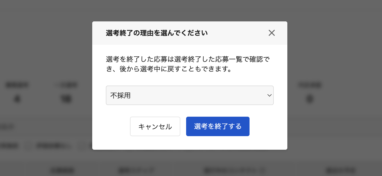 「選考を終了する」をクリックし、選考終了理由を選択する