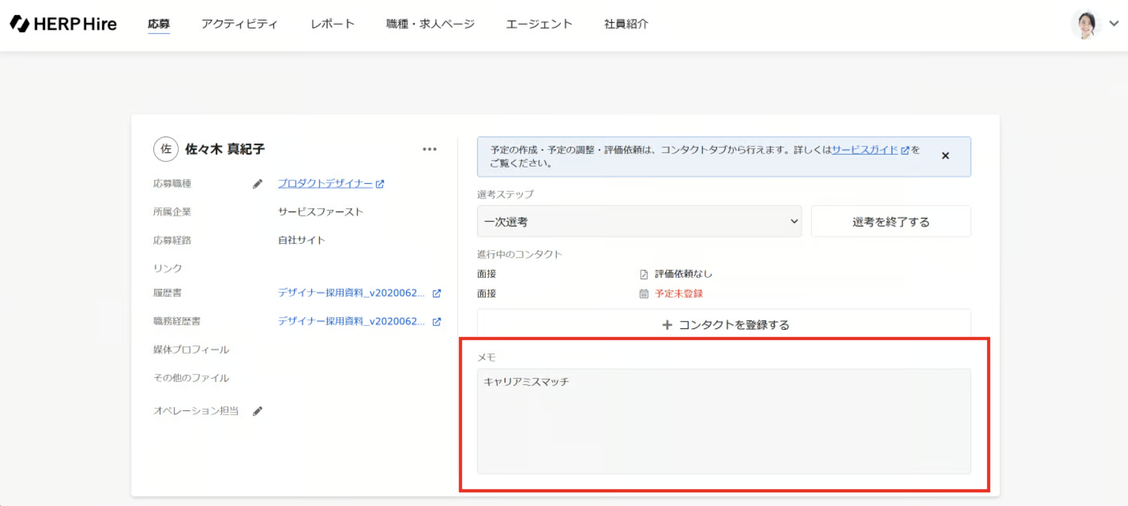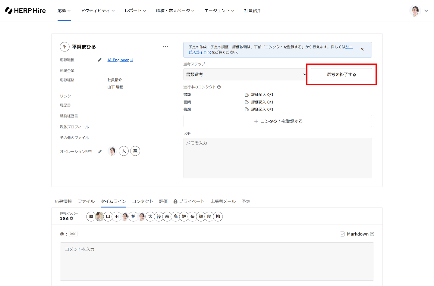 応募情報のメモ欄に選考終了理由を記載する