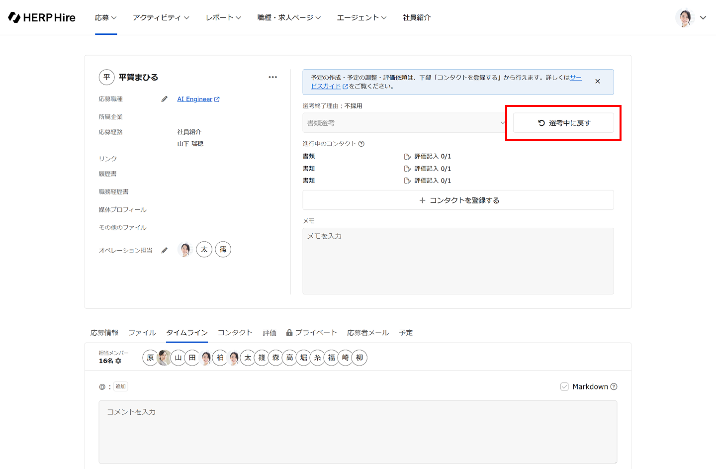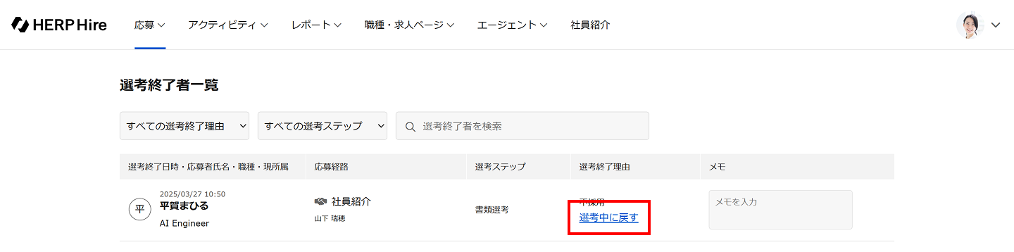 選考終了者一覧もしくは終了した応募詳細画面から「選考中に戻す」クリックします。