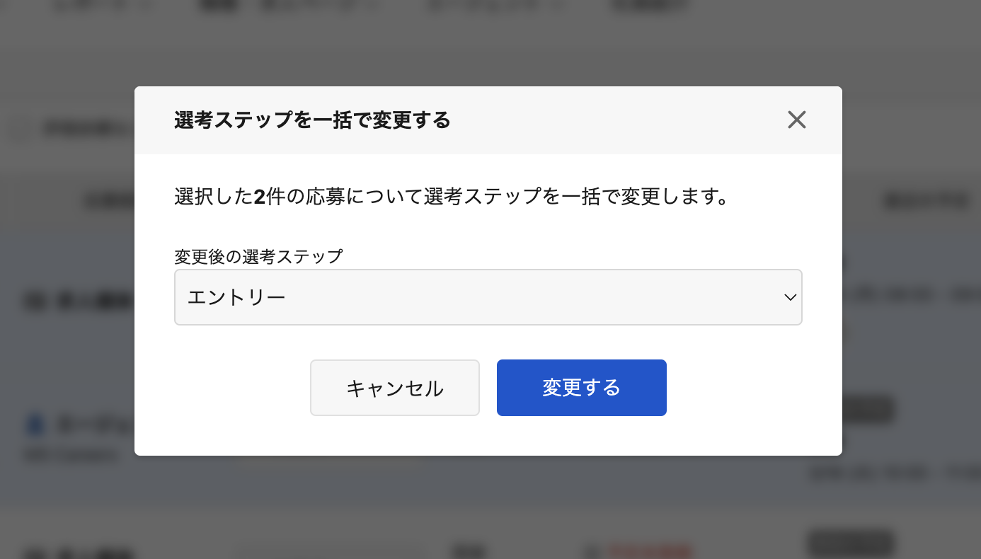 右上の 「一括変更 X名 」をクリックする※このボタンは応募者を選択するとクリック可能になります