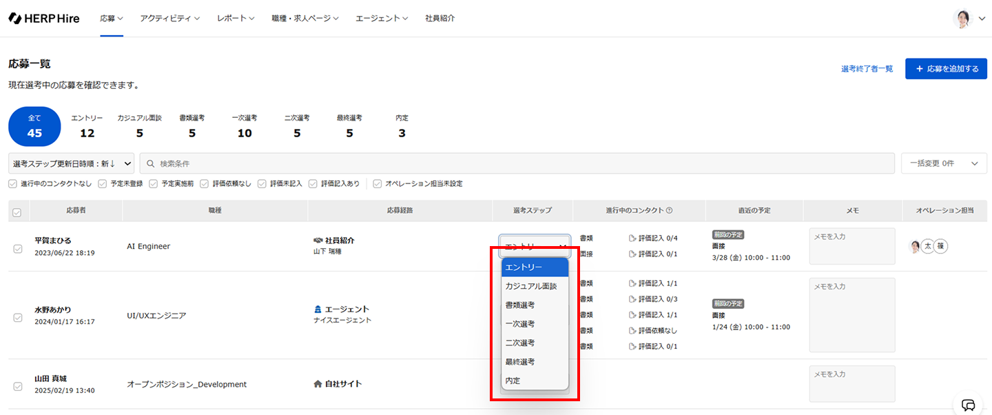 応募一覧もしくは、応募詳細で選考ステップを変更することができます。
