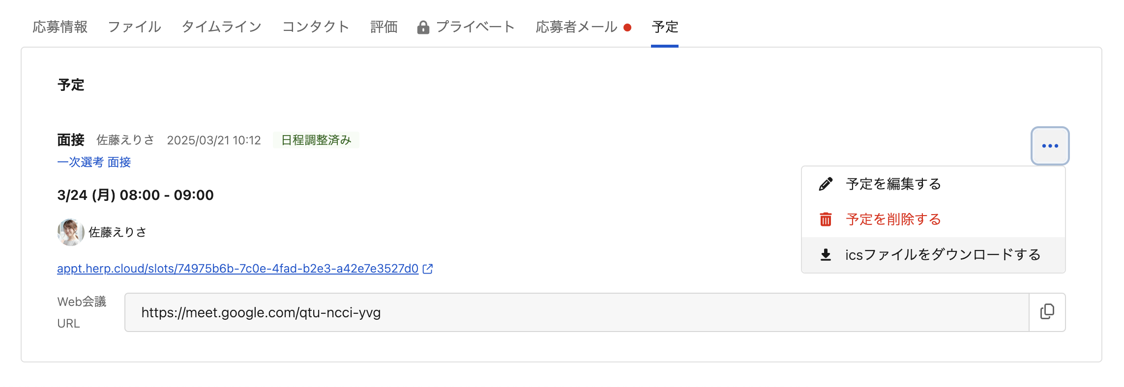 上記メールが受信できていない場合は、応募詳細の選考予定タブで予定への招待に関する ICS ファイルをダウンロードして取得できます。