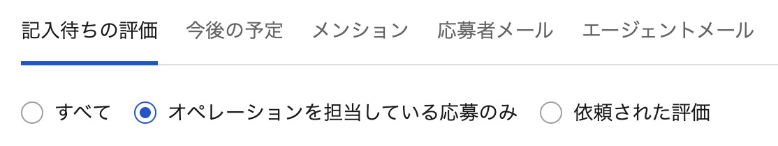 すべて:テナント内のすべての記入を待っている状態の評価依頼オペレーションを担当している応募のみ:ご自身がオペレーション担当にアサインされている応募の、記入を待っている状態の評価依頼依頼された評価:ご自身の記入を待っている状態の評価依頼