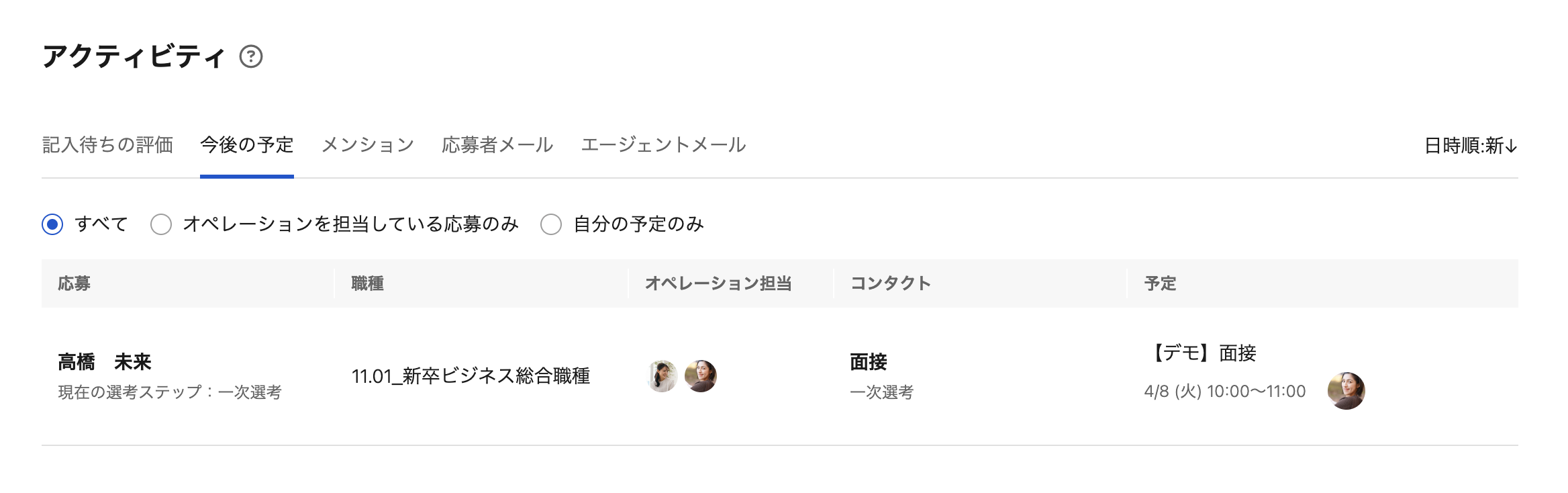 すべて:テナント内のすべての選考中の応募に紐づく今後の予定オペレーションを担当している応募のみ:ご自身がオペレーション担当にアサインされている応募に紐づく今後の予定自分の予定のみ:ご自身が参加者にアサインされている今後の予定