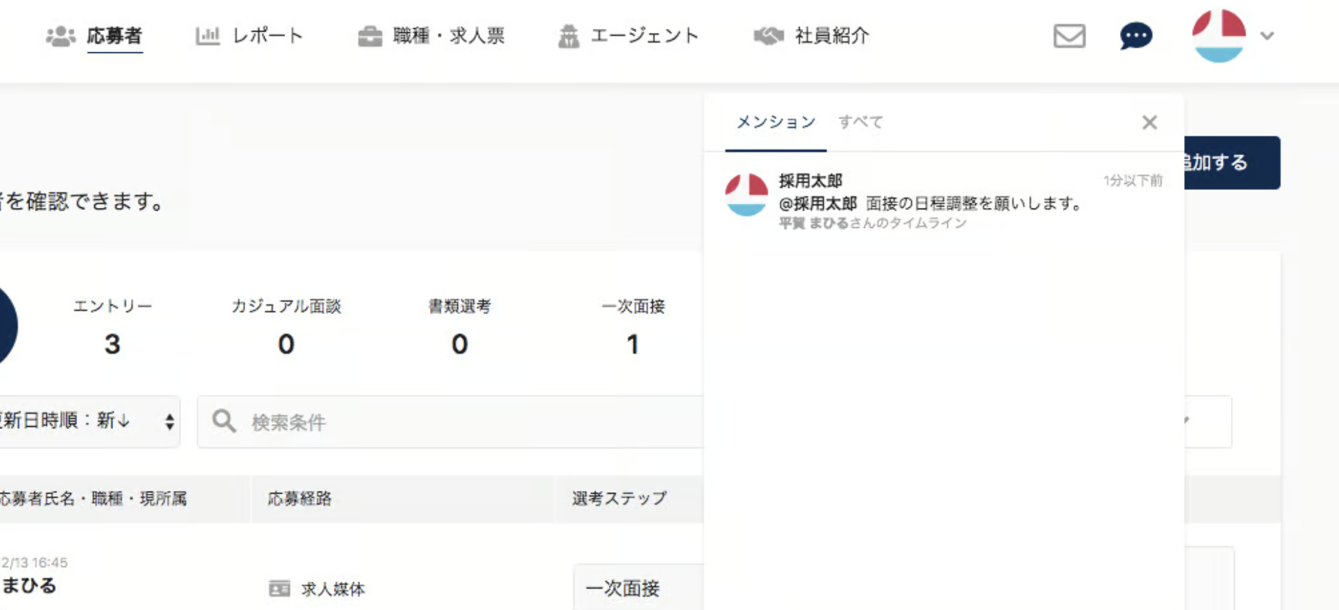 メンションされたコメントに紐づく応募の選考を終了すると、一覧から表示が消えます。