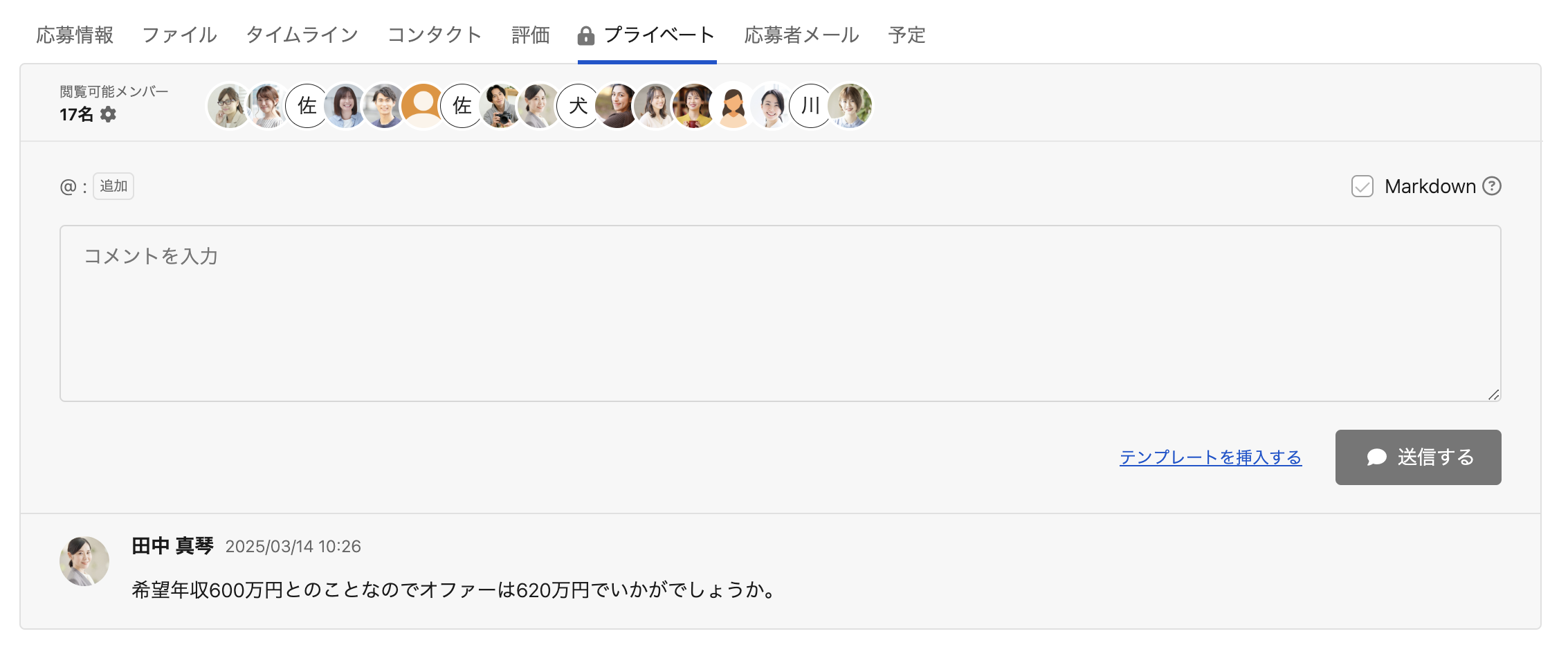 応募詳細の「プライベート」タブをクリックし、コメントを入力して「送信する」をクリックします。