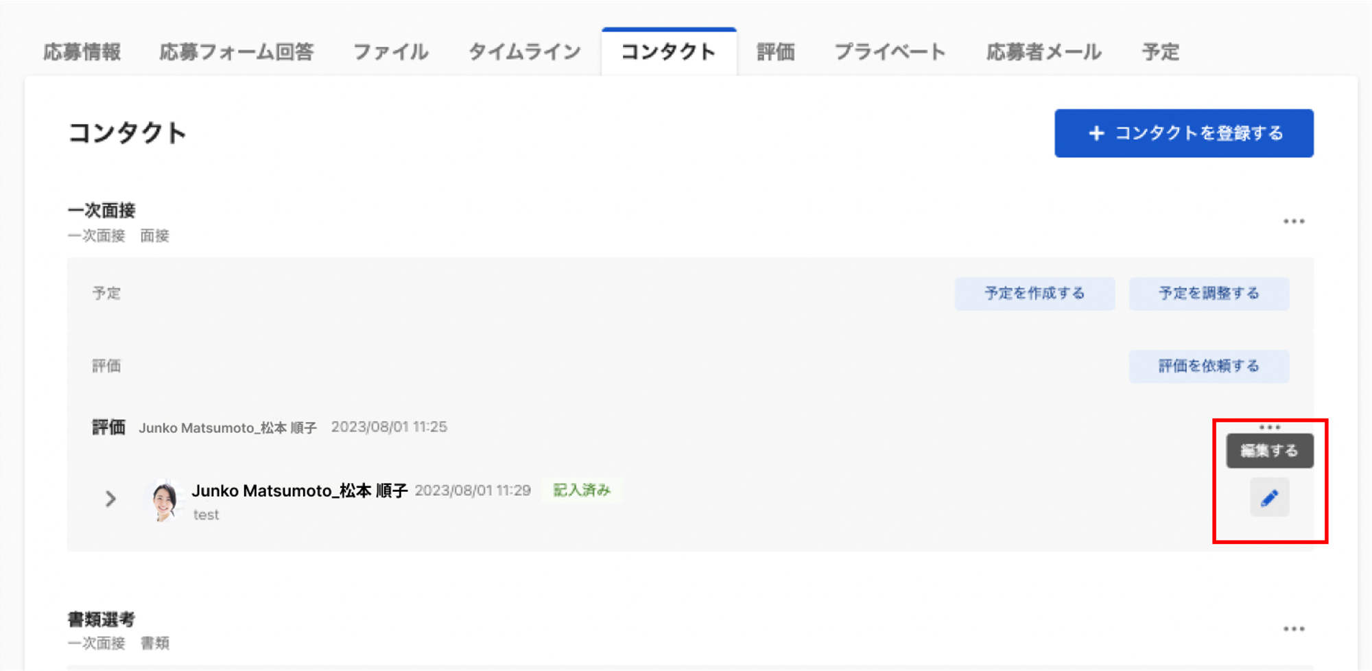 応募詳細の「コンタクト」タブから、自分が評価者として記入した評価にホバーし、「編集する」をクリックする
