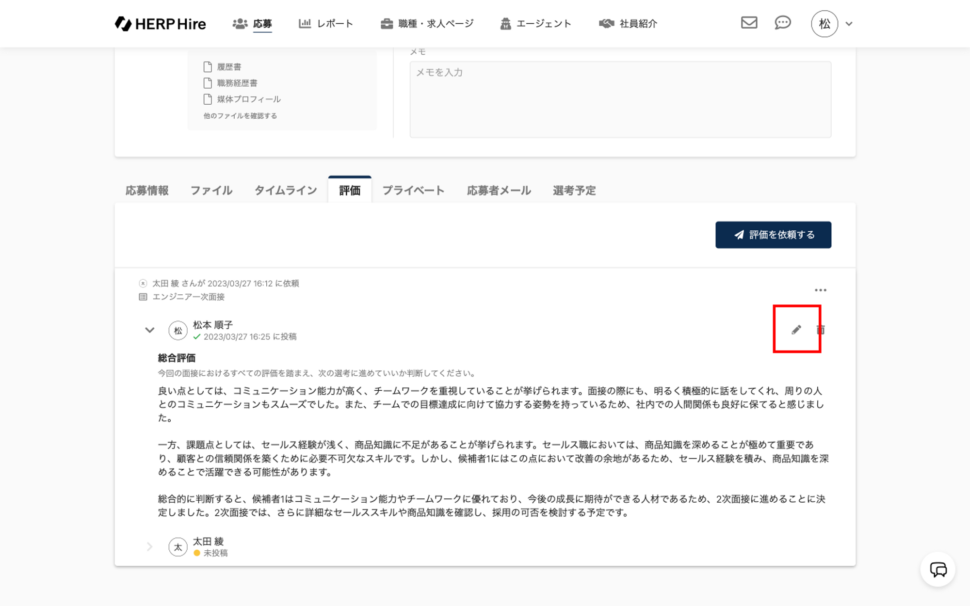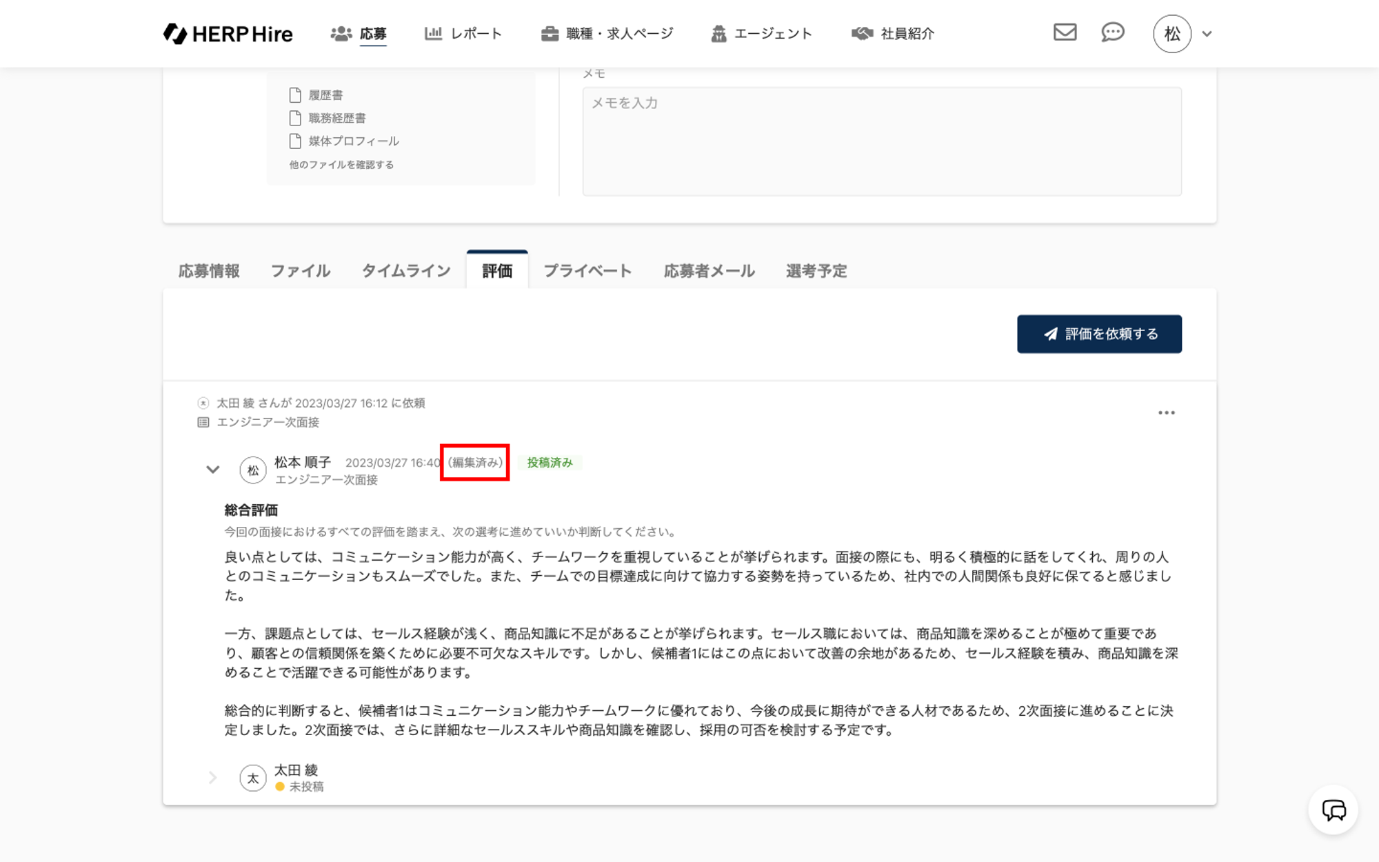 評価は編集しても、採用担当(評価依頼者)に通知は届きません。