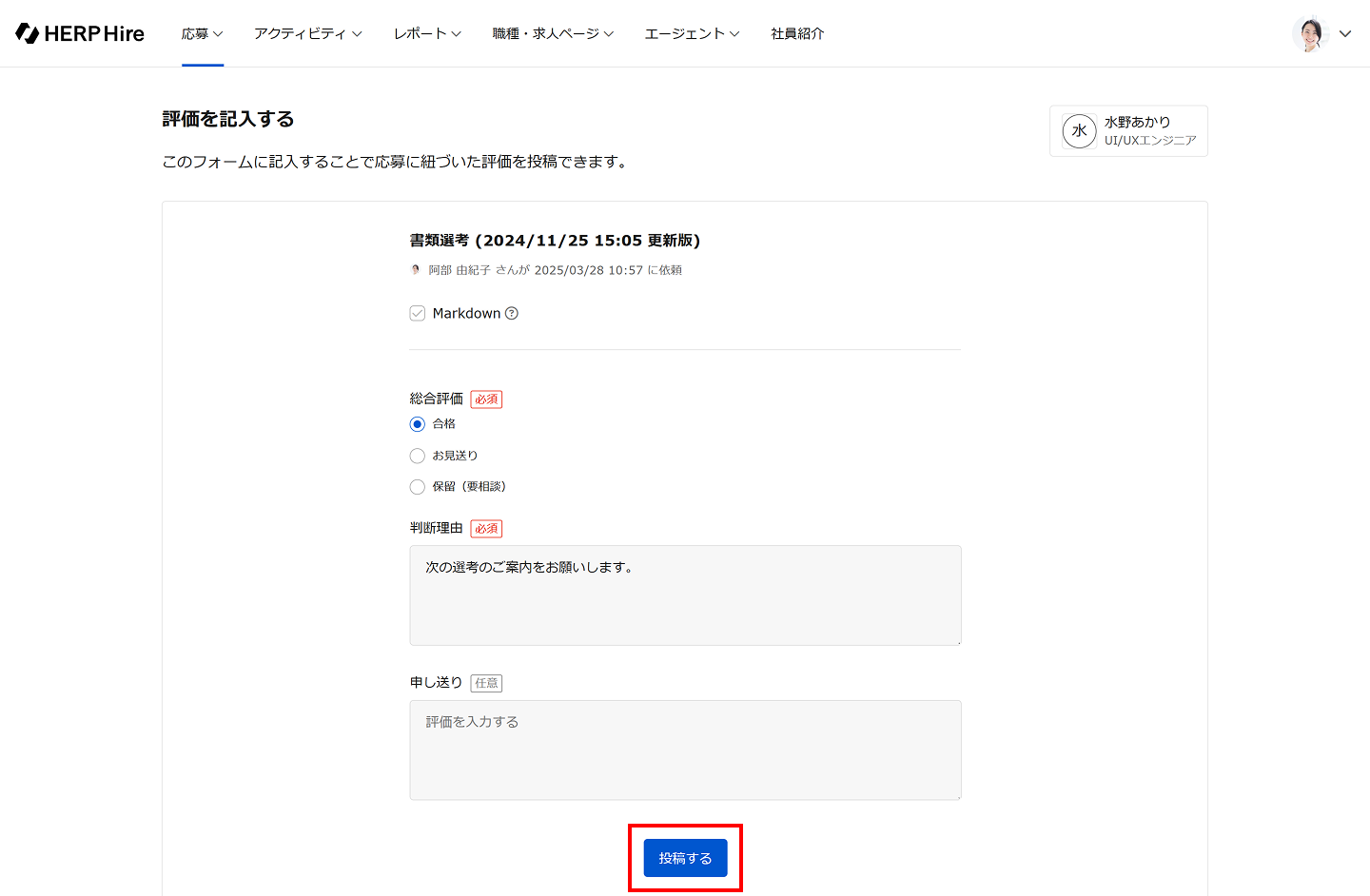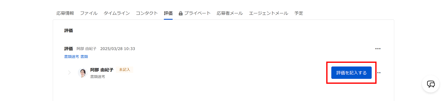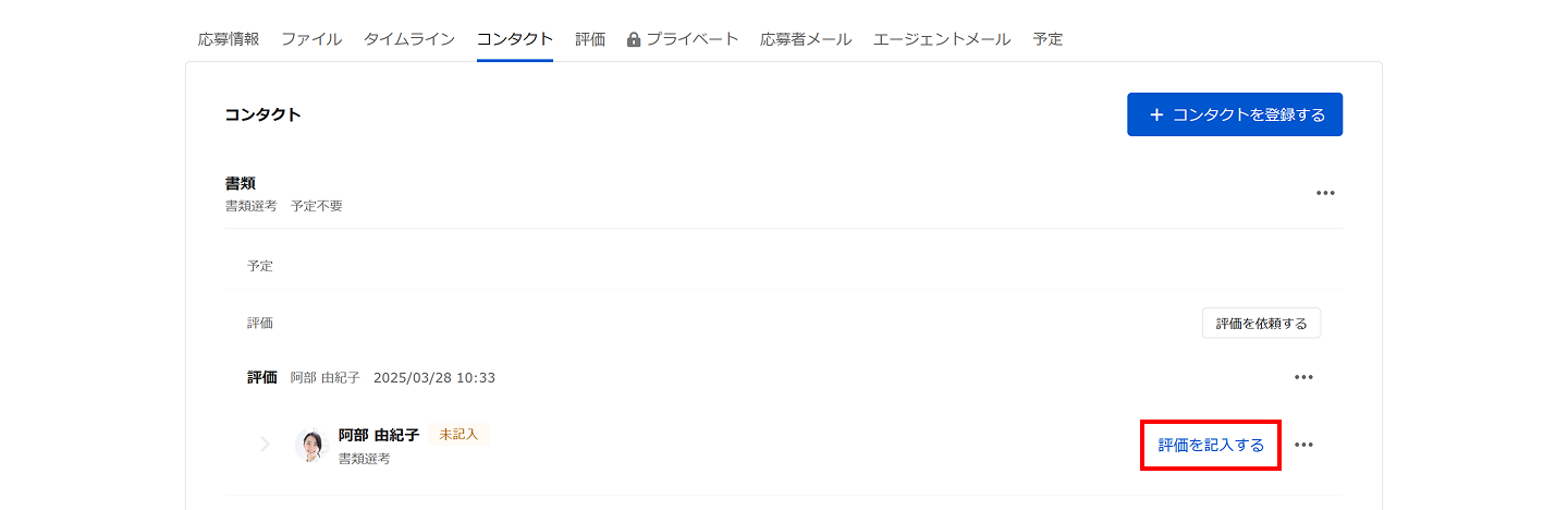 確認したいアクティビティをクリックすると応募の詳細ページに遷移するので、「コンタクトタブ」または「評価タブ」にて評価の記入ができる