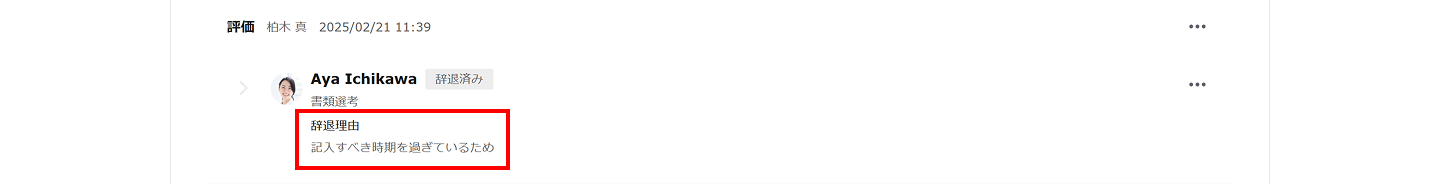 辞退すると、「コンタクトタブ」「評価タブ」に辞退理由が表示される