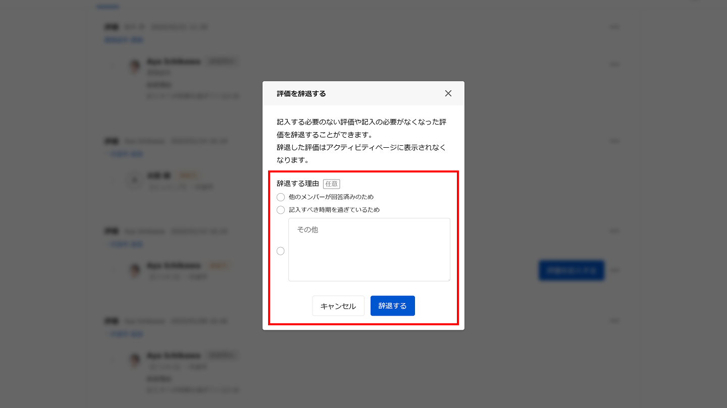記入の必要がなくなった未記入の評価を、評価を依頼されたユーザー側で辞退することができます。
