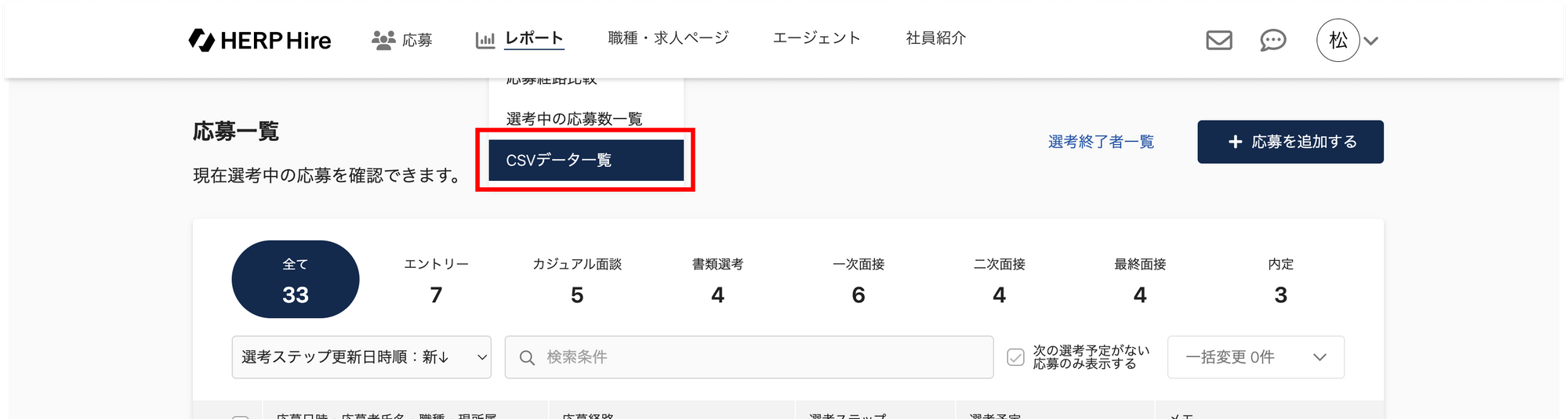 採用活動レポート(リニューアル版)にて集計用CSVをダウンロードすることができます。