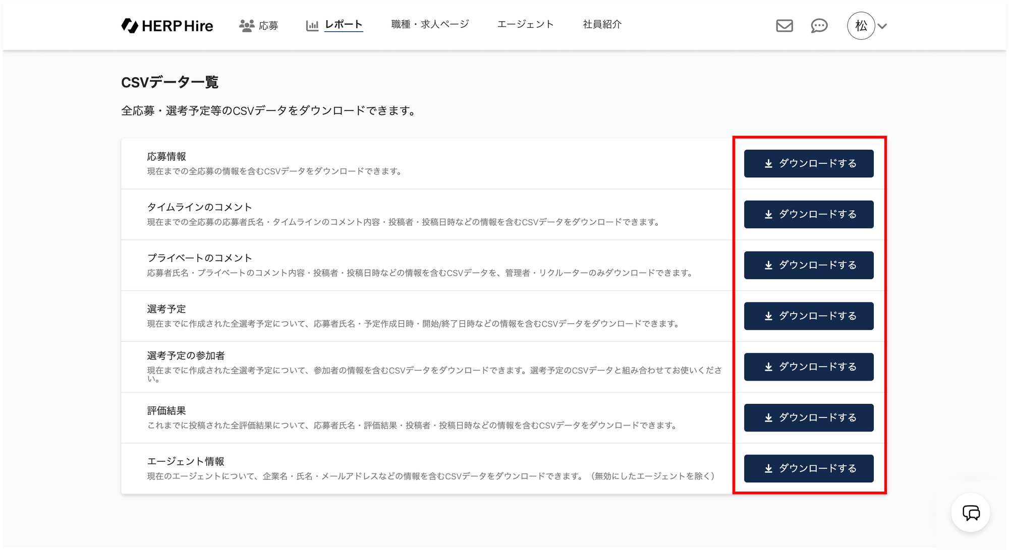 「プライベートのコメント」のダウンロードは「管理者」「リクルーター」権限のみ可能です。